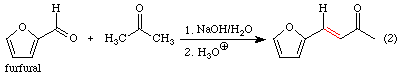 Acetone participates in a crossed-aldol reaction with furfural, an aldehyde produced from corn stalks, as described by Equation 2, where the carbon-carbon bond that is formed is highlighted in red.