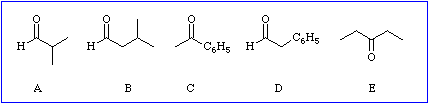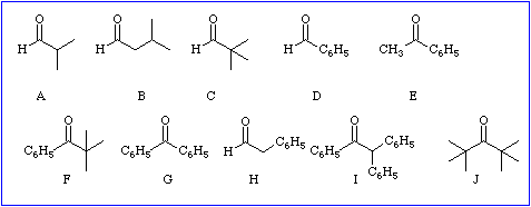 Exercise 5 Each of the following compounds was prepared by an aldol condensation followed by dehydration. In each case, select the structure of the starting material from the list of choices in the box below. Enter the appropriate letter into the text field.