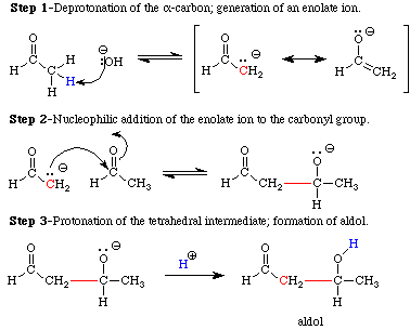 While the abstraction of an a-hydrogen is also a reversible reaction, the enolate ion that is formed has an alternative reaction pathway available to it- addition to the carbonyl carbon of another acetaldehyde molecule. This is called the aldol reaction. Figure 1 summarizes the process.