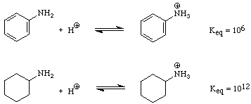 One piece of chemical evidence which is suggestive of this interaction is that aniline is approximately 1,000,000 times less basic than cyclohexylamine. Since the lone pair on the nitrogen in aniline experiences greater nuclear attractions, it is less likely to be attracted to another nucleus, e.g. a proton. Figure 5 compares the acid-base equilibria for aniline and cyclohexylamine.