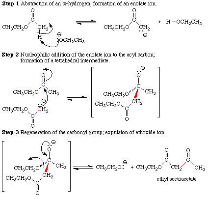 The equilibrium constant for the deprotonation of ethyl acetoacetate by ethoxide ion is approximately 105. The equilibrium constants for the steps leading up to the formation of ethyl acetoacetate range from 10-4 to 1. Coupling of the deprotonation step to the prior equilibria is what drives the Claisen condensation to completion. Experimentally the final step in the process is protonation of the chelated ion with aqueous acid during the work-up.