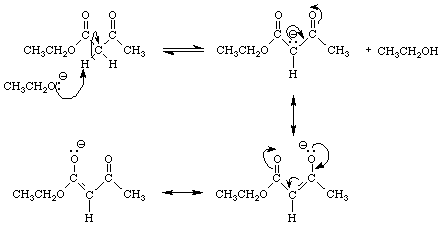 Notice that the product of the reaction contains a carbon atom that is a to two carbonyl groups. If that carbon is deprotonated, the resulting negative charge may be delocalized over both carbonyl groups by resonance. This double stabilization means that the a hydrogens are more acidic than hydrogens a to a single carbonyl group. In fact, the pKa of the hydrogens on the carbon atom flanked by two carbonyl groups in ethyl acetoacetate is approximately 11. Consequently, when the ethyl acetoacetate is formed it is immediately deprotonated by the ethoxide ion present in the reaction mixture. Figure 2A demonstrates these ideas.
