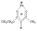 The negative charge is delocalized over the carbon and the two oxygen atoms. The sodium ion is coordinated to both oxygen atoms simultaneously in what is known as a chelated structure. The word chelate comes from the Greek chelos which means claw.