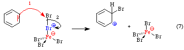 The complex in reaction 6 is regarded as an electrophilic species because of the presence of the positively charged bromine atom. Having a positive charge on an electronegative atom is energetically unfavorable, i.e. the complex has a high potential energy. It is highly reactive. Equation 7 indicates the reaction pathway that is followed when the complex is formed in the presence of a (weakly) nucleophilic species, specifically benzene.