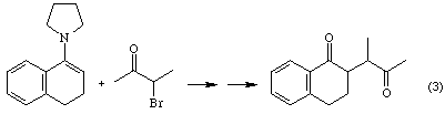 Since enamines are inherently less reactive than their enolate ion analogs, it is necessary to treat them with highly reactive alkylating agents in order to effect a reaction. Equation 3 provides a representative example.