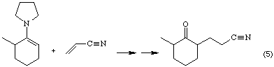 Although enamines are not as nucleophilic as their enolate ion equivalents, their relatively low reactivity makes them excellent partners for Michael additions. Thus, the enamine derived from 2-methylcyclohexanone reacts with acrylonitrile as shown in Equation 5.