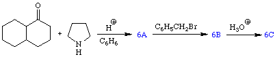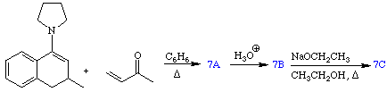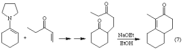 Michael addition of enamines to a,b-unsaturated ketones may be coupled with intramolecular aldol condensations to produce cyclic ketones. This sequence of reactions is an alternative approach to traditional Robinson annulations. Equation 7 provides an example.