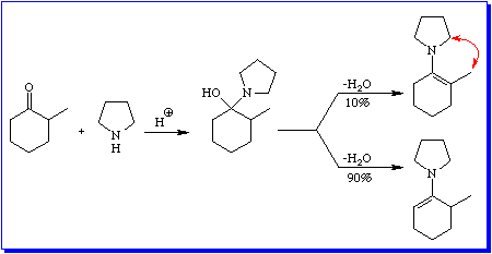 The reaction produces a mixture of enamines in which the less substituted isomer predominates. Presumably a steric interaction between the methyl group of the cyclohexyl ring and the methylene group of the pyrollidine ring, shown by the red arrow in the figure, reduces the extent of conjugation between the lone pair of electrons on the nitrogen atom and the pi system of the double bond in the more substituted case.