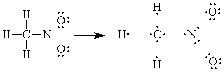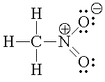 As before, the formal charges on hydrogen and carbon are zero. So is the formal charge on the oxygen atom that is doubly bonded to the nitrogen. But the formal charge on the oxygen atom that is singly bonded to the nitrogen is -1; it has 7 valence electrons to go with its 2 inner shell electrons, giving it 9 units of negative charge versus the 8 units of positive charge in the nucleus of the atom. The four valence shell electrons and the two inner shell electrons of the nitrogen atom are one less than its atomic number. Thus the formal charge on the nitrogen atom is +1. Overall nitromethane is neutral. A more complete representation of the structure of nitromethane than that shown in Figure 3 would include the formal charges on the oxygen and the nitrogen atoms: