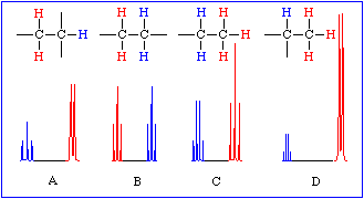 Note that the number of lines in each blue signal is one more than the number of red hydrogens. Similarly, the number of lines in each red signal is one more than the number of blue hydrogens. The number of lines in a signal is called the multiplicity of the signal. In the ideal case, the multiplicity of a signal arising from a set of hydrogen atoms is one more than the number of hydrogen atoms 3 bonds away.
