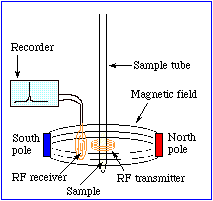 A fundamental equation of spectroscopy is DE = hn, where DE represents the difference in energy between two states of a system, n symbolizes frequency of electromagnetic radiation, and h is a proportionality constant. This equation says that a sample will absorb electromagnetic radiation when the frequency of that radiation matches the difference in energy between two energy states of the system. For NMR spectroscopy the frequencies of interest are in the radio frequency (RF) range, typically 60-500 MHz depending upon the strength of Bo. This is in the radio frequency range and an RF transmitter is the source of the electromagnetic radiation. The condition where DE = hn is referred to as resonance. The absorption of energy creates an excited state of the system. The process whereby the system returns to its lowest energy state, i.e. its ground state, is called relaxation. One way for the system to relax to the ground state is for it to emit radiation. If a suitable detector is available, e.g. an RF receiver, the emitted radiation may be recorded as a peak on a graph. Figure 3 provides a schematic diagram of the apparatus that is required for NMR spectroscopy.