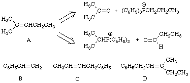 The value of the Wittig reaction lies in its generality. It works well with aliphatic and aromatic aldehydes and ketones. Furthermore, these compounds may contain other functional groups such as alcohols and esters which are not compatible with Grignard reagents. Exercise 3 Alkenes A-D may be prepared by two alternative Wittig reactions. Following the example shown for alkene A, draw the structures of each aldehyde/ketone-phosphonium ion pair that could be used.