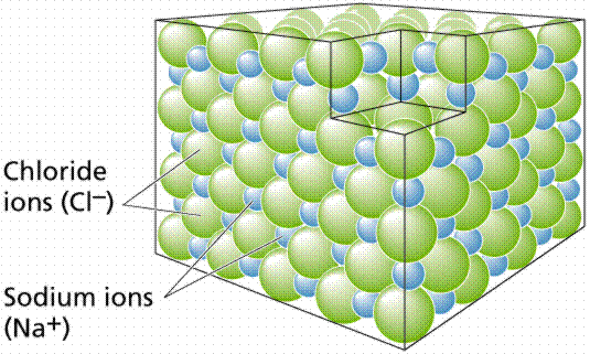Formation of a crystal of sodium chloride. Each positively charged sodium ion is surropunded by six negatively charged chloride ions; likewise each negatively charged chloride ion is surrounded by six positively charged sodium ions. The overall effect is electrical neutrality. Image from W.H. Freeman and Sinauer Associates, used by permission.