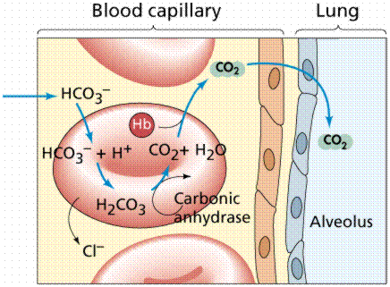 In the alveoli capillaries, bicarbonate combines with a hydrogen ion (proton) to form carbonic acid, which breaks down into carbon dioxide and water. The carbon dioxide then diffuses into the alveoli and out of the body with the next exhalation.