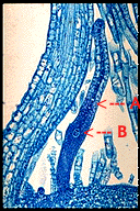 | Flask-like archegonium (A) with single egg cell (B) at base of canal. Biodisc photomicrograph |