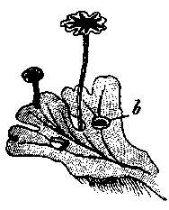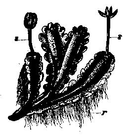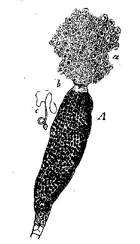 | Club-shaped antheridium (A) with mass of antherozoids (a) being discharged. A single biflagellate antherozoid or sperm cell (b) is also shown. |