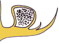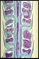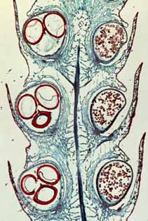 At left is an L.S. of a Lycopodium cone. Note the sporangium in the axil of each sporophyll. Each sporangium is full of numerous tiny spores, similar in size to those of ferns. Incidentally, these spores were once used in fireworks (their high oil content makes them burn readily) and more recently to "dust" condoms. |