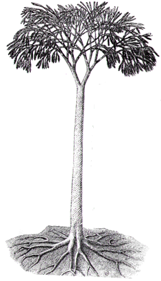 Lepidodendron was a giant tree-like club moss. It towered to 45 m in height and flourished in the swamp forests of the Carboniferous. |
