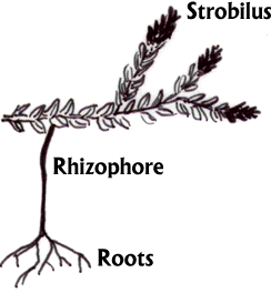 | In Selaginella the roots are typically borne on a rhizophore which extends from the stem. |