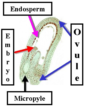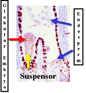 Embryo Development occurs within the Ovule, near the Micropyle. The zygote has a transverse division which produces a Terminal and a Basal cell. The Basal Cell divides transversely to produce the Suspensor. The Terminal Cell divides in many planes to produce a 3-Dimensional structure called the "Embryo Proper". The Embryo Proper produces most of the embryo. The Suspensor contributes to the formation of the Root Apex. Further growth of the Embryo Proper leads to a Globular stage. |