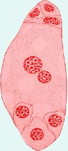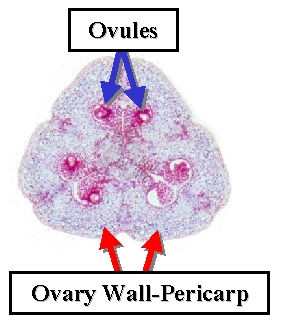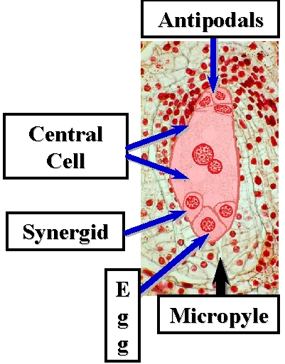 haploid Nuclei divide again to produce a cell with Eight Nuclei. This process is called Free Nuclear Division. Following Nuclear migrations & cell formation, the It is typically composed of an Egg Apparatus (Egg + 2 Synergids) at the Micropylar end of the Megagametophyte. A large, multinucleate Central Cell occupies most of the volume of the gametophyte. Three Antipodals are found at the Chalazal end of the Megagametophyte. |
