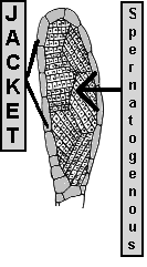 The Gametophytes produce multicellular Gametangia. Gametangia produce Gametes. Gametangia have a sterile, protective covering layer of cells called a Jacket. The Reproductive Cells are internal. These are called Spermatogenous Cells if they produce Sperm. Sperm are produced in Antheridia. |