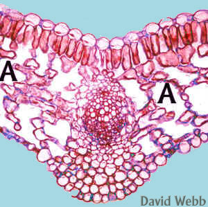| The Spongy Mesophyll is a common form of Aerenchyma (A=Air Space) | the photosynyhetic Parenchyma in Marchantia has a lot of air spaces which makes it Aerenchyma | Aerenchyma in a semiaquatic Makaloa Stem (Cyperus laevigatus) | ||||||||||||||