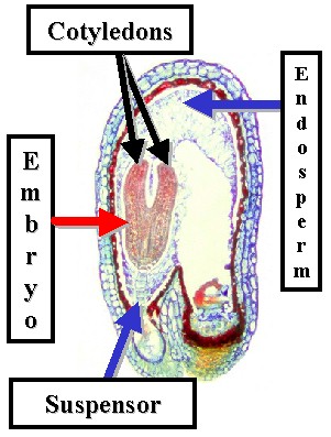 Embryo Development occurs within the Ovule, near the Micropyle. The zygote has a transverse division which produces a Terminal and a Basal cell. The Basal Cell divides transversely to produce the Suspensor. The Terminal Cell divides in many planes to produce a 3-Dimensional structure called the "Embryo Proper". The Embryo Proper produces most of the embryo. The Suspensor contributes to the formation of the Root Apex. Further growth of the Embryo Proper leads to a Globular stage. |