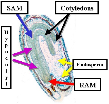 | The cotyledons become large structures in Capsella and familiar legumes like peas and beans. In some cases the cotyledons do not occupy the greatest part of the seed which may contain a large, residual endosperm. | Mature Embryo in Seed SAM = Shoot Apical Meristem RAM = Root Apical Meristem |