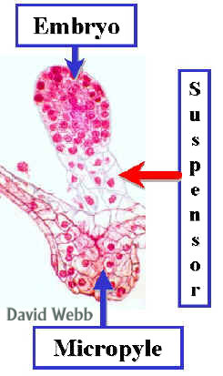 Double FertilizationIn some plants, one of the Synergids starts to die. It must release some chemotactic agent because the pollen tube is attracted to it. The Pollen Tube grows through the Micropyle & may enter the senescent synergid. The pollen tube wall degrades and the sperm are released. The Egg and the Central Cell have incomplete cell walls & the sperm has no wall. One Sperm enters the Egg while the other enters the Central Cell. The Zygote is formed when a Sperm nucleus fuses with the egg nucleus (Syngamy). This will develop into the Diploid Embryo. The Endosperm is formed by the fusion of a sperm nucleus with the nuclei of the Central Cell. It is therefore Polyploid (3N). The Endosperm surrounds the developing embryo and provides a source of nutrition for the Embryo during its differentiation & during Germination of many plants. Thus, Double Fertilization occurs! |