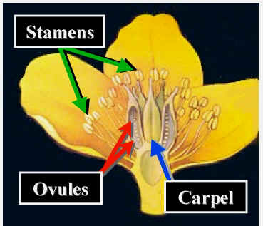 | Long section through a mature Ranunculus flower. Note the Ovules which lie in the Ovaries of each Carpel. The Ovules contain the Megagametophyte or Embryo Sac. Also note the Stamens which produce Pollen the Microgametophyte. |