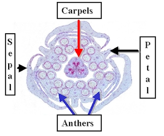 Longitudinal Views of Datura and Tomato (Lycopersicum) Showing important floral structures. Both are members of the Solanaceae and share some common features. Note the Stigma and Style on the Tomato Carpel. Pollen is trapped by the fluid on the Stigma. It germinates and travels through the Style to the Ovules in the Ovary. |