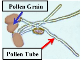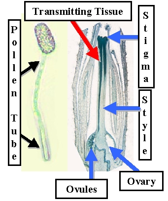 Pollen arrives on the Stigma & Germinates. The Pollen Tube grows between the Cell Walls of the Transmitting Tissue in the Style. Pollen Tubes eventually reach the Micropyle of Ovules in the Ovary. |