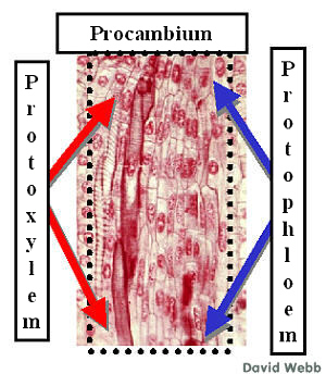 Phloem also comes from the Procambium. Protophloem differentiates from the outermost Procambium, directly opposite the Xylem. Phloem differentiation is hard to follow because the Sieve Elements do not have dramatic features like the Tracheary Elements in Xylem. | |