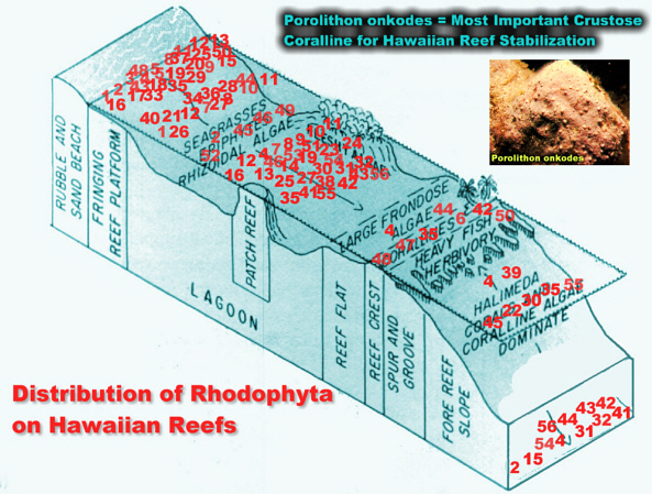 One of these, Porolithon onkodes, is the major "crustose" coralline alga that stabilizes Hawaiian reefs. The Reef Crest is referred to as the Porolithon Ridge.