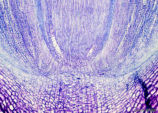 Banana RAM - Higher Magnification - The three layers of the body converge on a few "Initial Cells". The Root Cap has a distinctly separate origin (Calyptrogen). However, that is not as clear as it could be in this specimen. |
