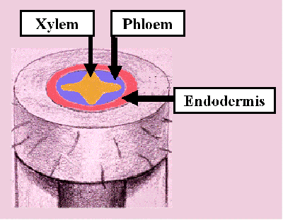 Vascular cylinder from a Ranunculus root. The xylem has a star-like appearance. The Phloem occupies the indentations between the Xylem arms. The Endodermis is the layer of small cells which surrounds the vascular tissues. Endodermal cells opposite the Phloem have thick lignified Cell Walls while those opposite the xylem do not. |