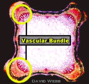 Coleus Stem stained with Phloroglucinol. The large Vascular Bundles are located in each Corner of the stem. |
