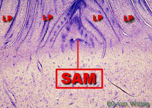 Vegetative shoot apical meristems are said to be "Indeterminate" which means that they have "unlimited" growth potential. The sequence of events which lead to leaf production involve alternating patterns of LOCALIZED Cell Divisions which produce leaf primordia, followed by a restoration of the SAM and another highly localized leaf initiation event. It is important to remember that cell divisions do NOT occur throughout the entire vegetative SAM and that the SAM is relatively small.