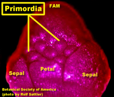 ![]() Flowering Apex of Ranunculus: The Sepal and Petal Primordia have begun to develop. The Stamen Primordia are just visible. Carpel Primordia will eventually develop at the summit of the apex. |