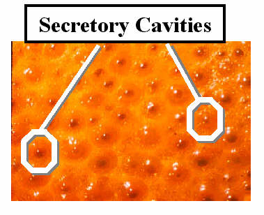 Citrus fruits contain massive Secretory Cavities These contribute to the aroma and taste of the fruit. The "rind" is used to extract flavor and is also used for candy production. | ||