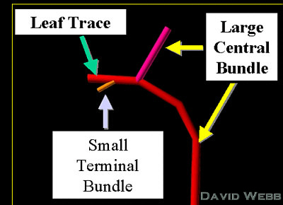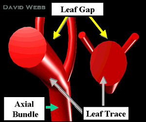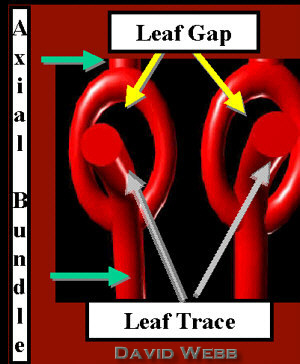 These will produce Leaf Traces at regular intervals. A leaf trace is a vascular bundle which diverges from the axial bundles in the stem and enters a leaf.