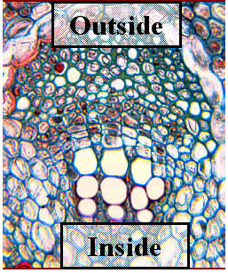 The first step in xylem differentiation is cell enlargement. This establishes the pattern in which Tracheary Elements will differentiate. The innermost xylem cells have the narrowest diameter. Those at the opposite pole have the largest diameter. | ||
