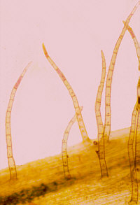 These are multicellular, non-secretory trichomes. It is not easy to characterize a trichome as secretory or non-secretory based on appearance alone. Secretory trichomes do have a characteristic anatomy, as you will see. | ||